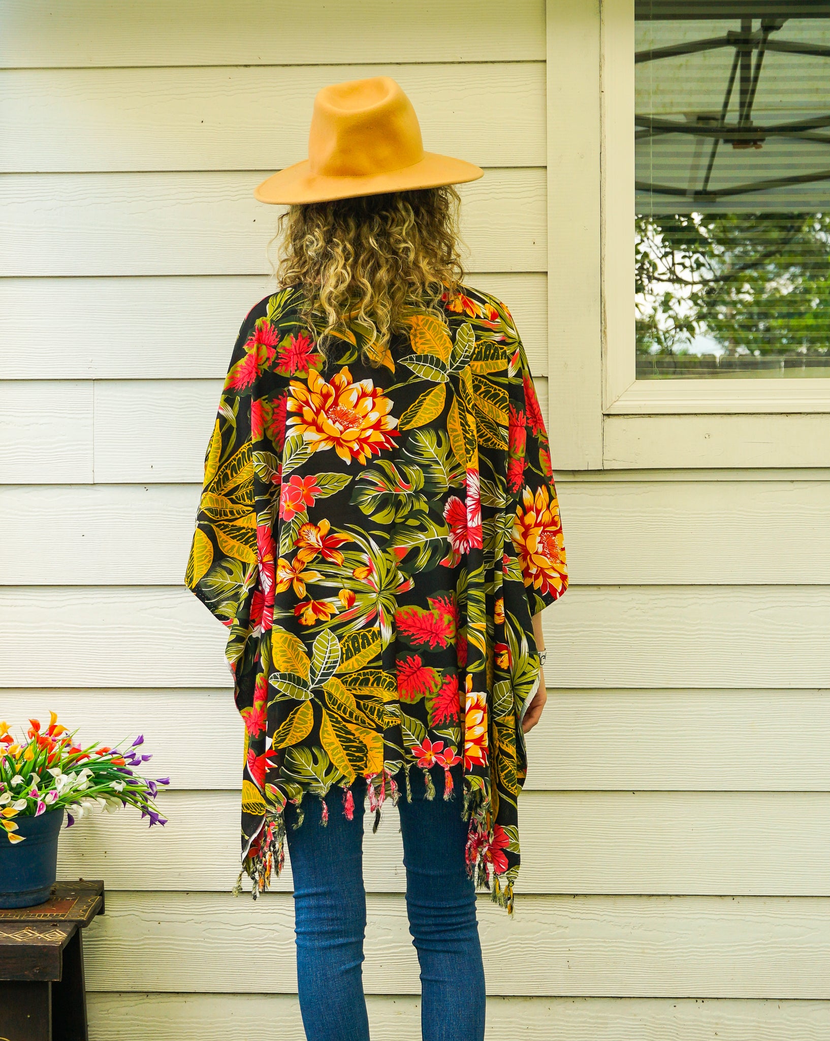 Bring the tropics with you in the Hibiscus & Palm Kaftan – a lush mix of fiery red and golden hibiscus blooms layered with vibrant green palm leaves on a deep black background. Lightweight, breezy, and made for movement, it’s your go-to piece for beach days, resort lounging, or adding a splash of tropical energy to everyday wear.