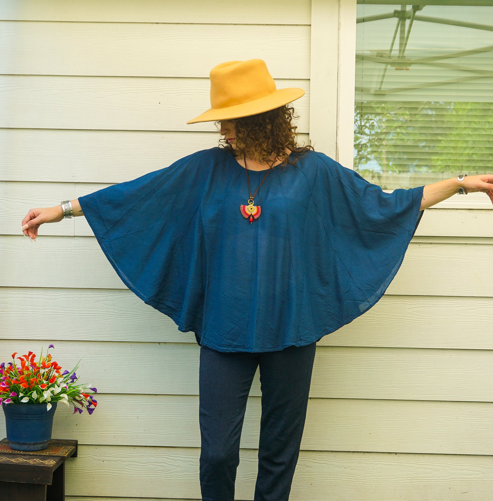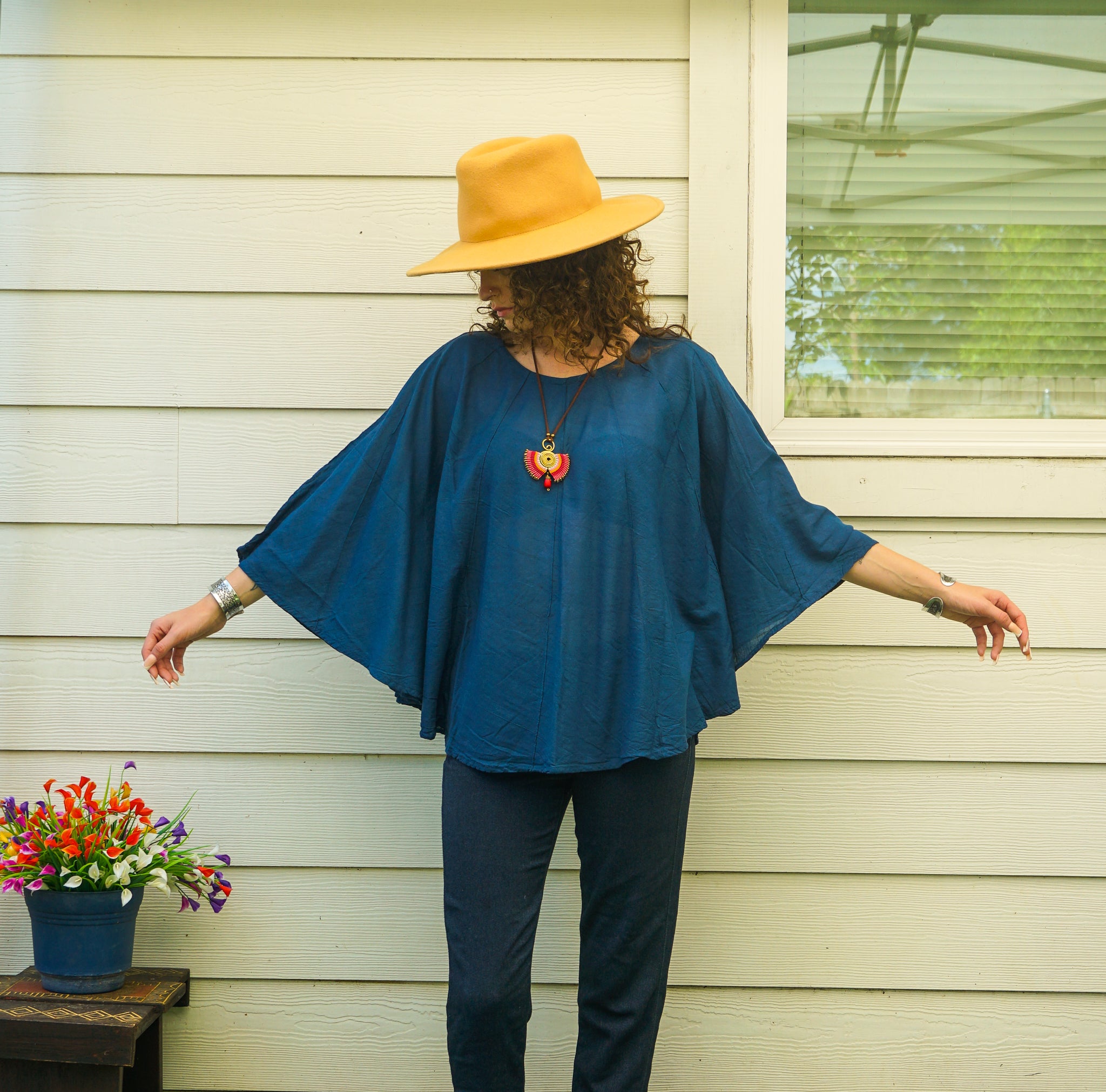 The wide, winged silhouette drapes beautifully over the body, offering a relaxed fit that flatters a wide range of shapes. Midnight Teal is a rich, grounding blue inspired by twilight skies and deep ocean waters — calming, soulful, and endlessly wearable.