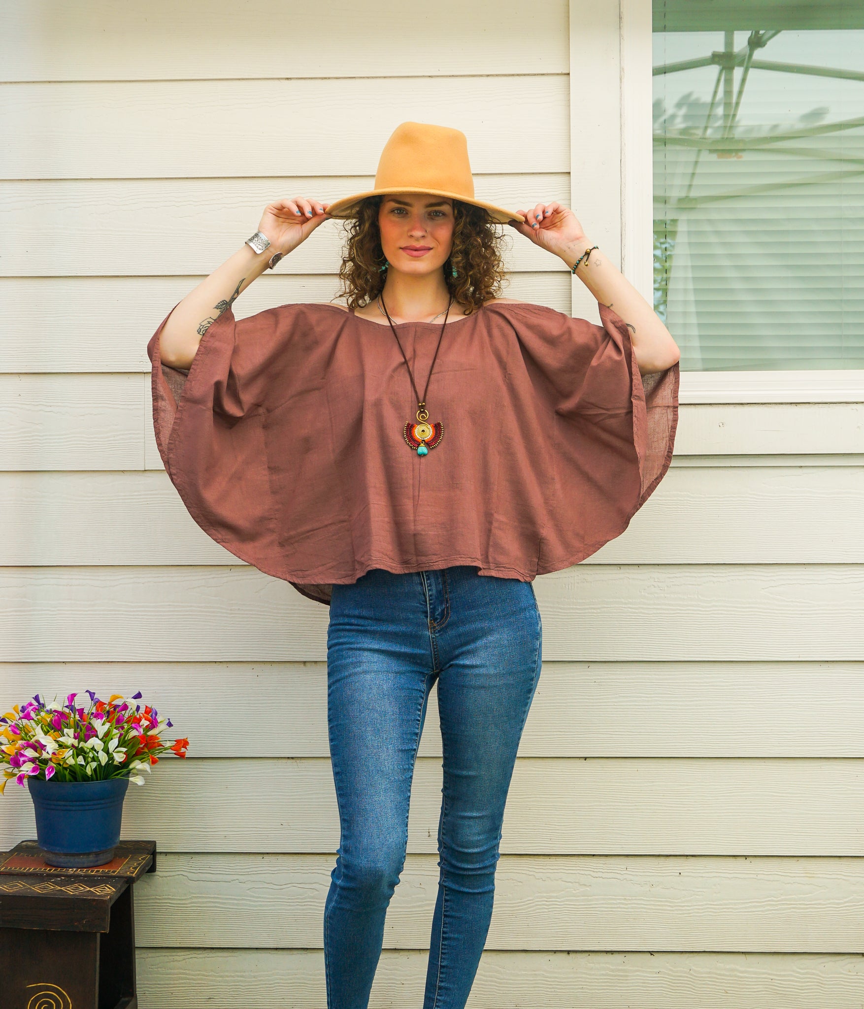 The relaxed kimono silhouette showcases wide, draped sleeves and an open-shoulder neckline that creates a graceful, flattering shape without restriction. The dusty rose hue brings warmth and softness, blending earthy bohemian charm with timeless femininity. Easy to style with denim, linen, or layered accessories, this blouse transitions seamlessly from everyday wear to travel and relaxed gatherings.