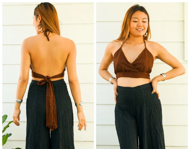 Earthy, feminine, and made for movement — this brown halter wrap crop top is the ultimate boho festival essential.