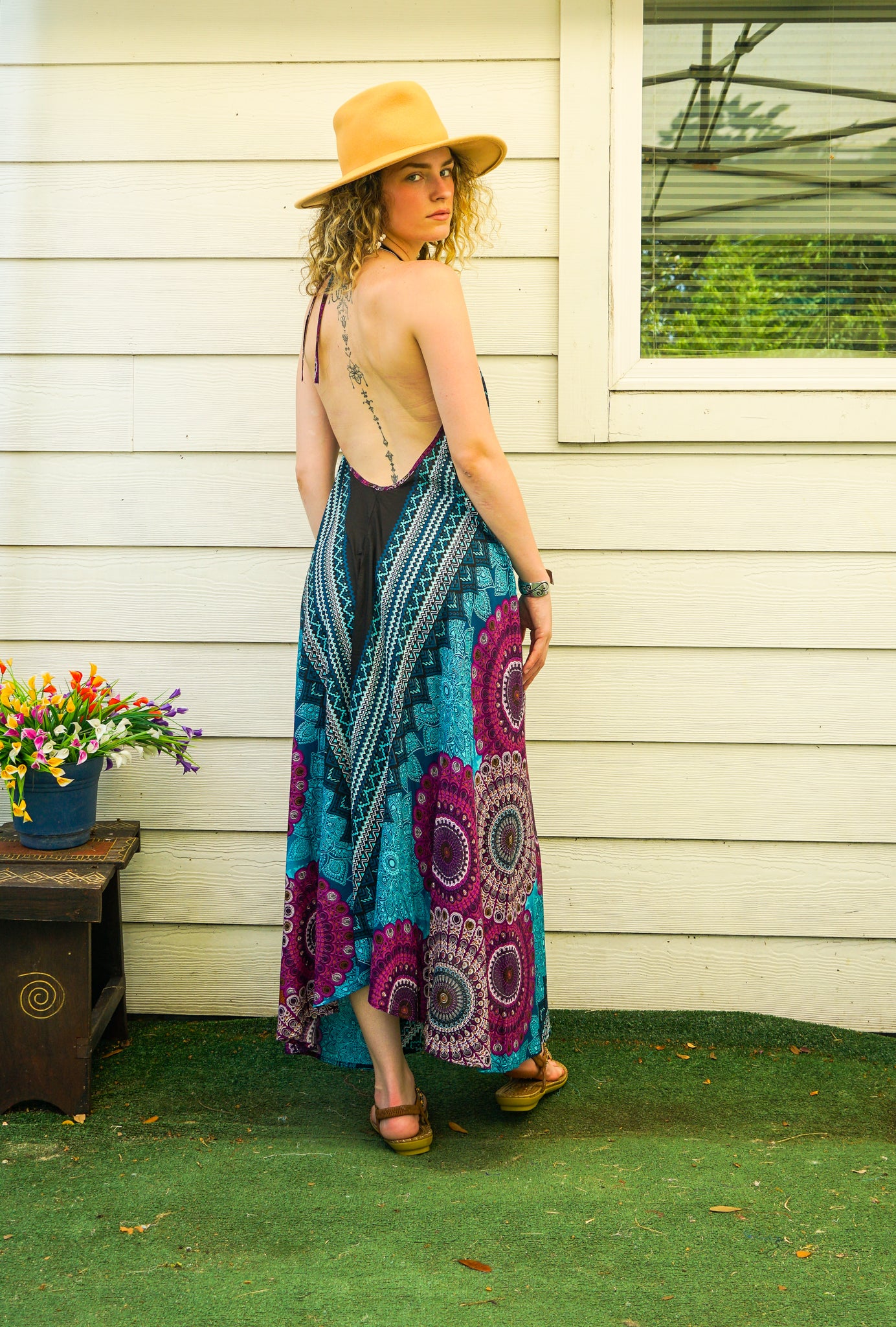 The Mandala Tide Halter Maxi Dress is a bold bohemian statement, blending intricate mandala artistry with fluid, free-flowing movement. Rich jewel tones of teal, plum, and deep charcoal create a mesmerizing pattern that feels both grounded and expressive—perfect for those who dress with intention and soul.