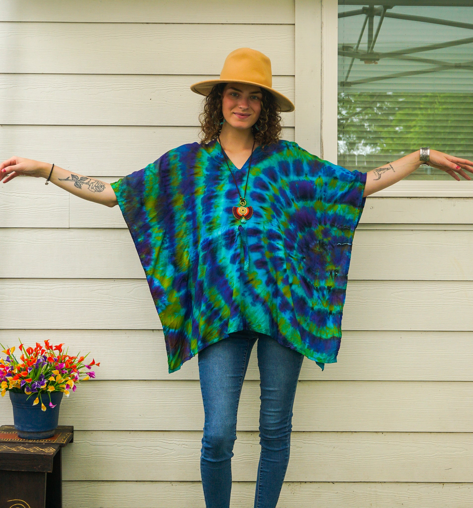 Immerse yourself in the tranquil energy of Jade Tide — a flowing tie-dye kaftan blouse inspired by the rhythm of water, earth, and sky. This mesmerizing piece features rippling waves of jade green, aqua blue, ocean teal, deep indigo, and hints of forest purple, creating a look that feels both grounding and expansive, like standing at the edge of a quiet tide pool.