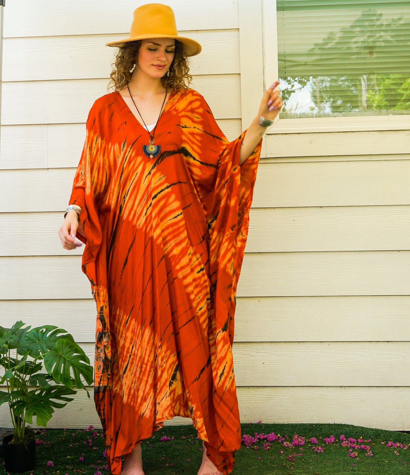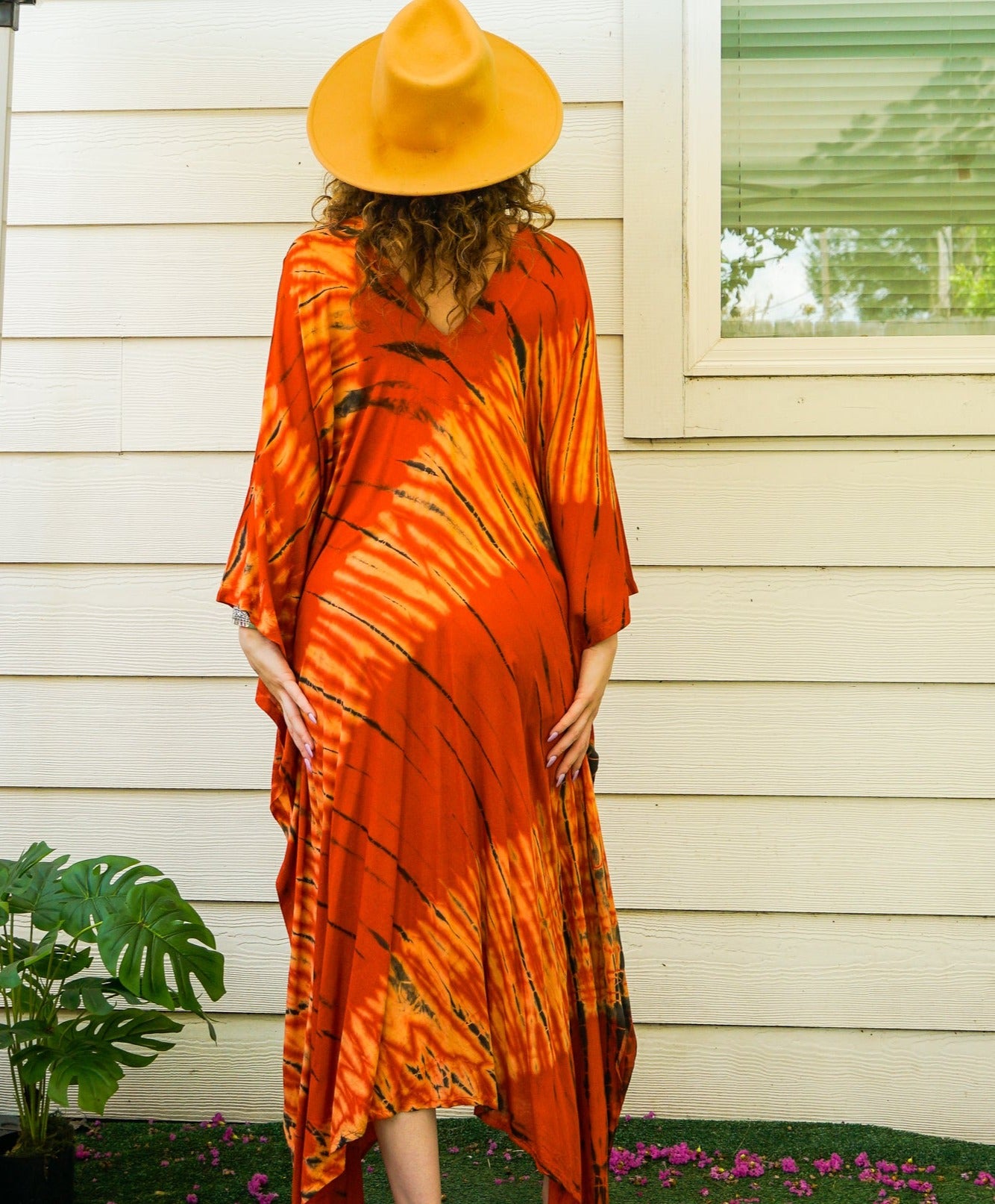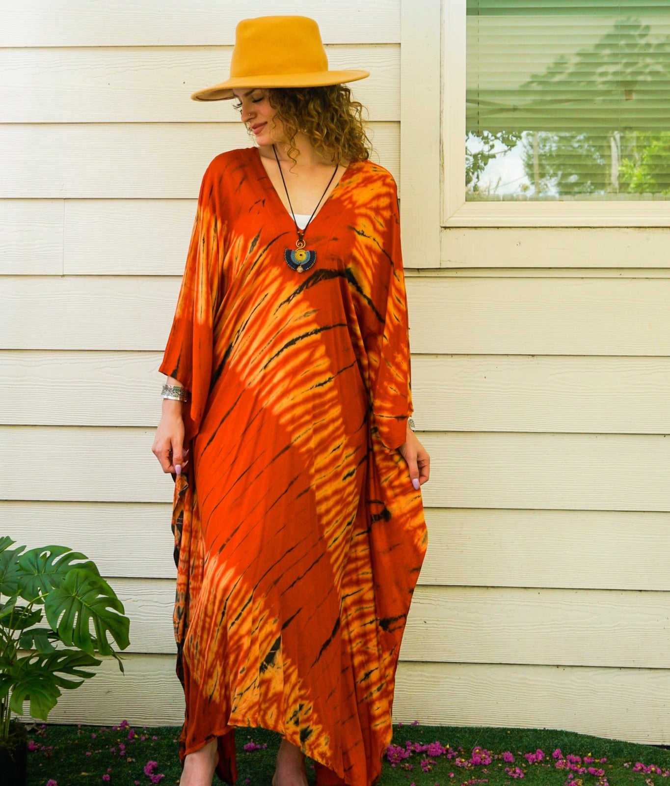The Ember Flame Tie-Dye Kaftan is a bold and fiery statement piece, featuring a radiant orange base complemented by striking black and warm yellow tie-dye patterns. The flowing, oversized silhouette ensures maximum comfort and elegance, making it ideal for any occasion. With a soft, breathable rayon fabric, the kaftan offers a lightweight and airy feel, perfect for warm weather or casual outings. The dramatic design pairs beautifully with simple accessories and sandals, adding an effortless bohemian charm to your wardrobe.