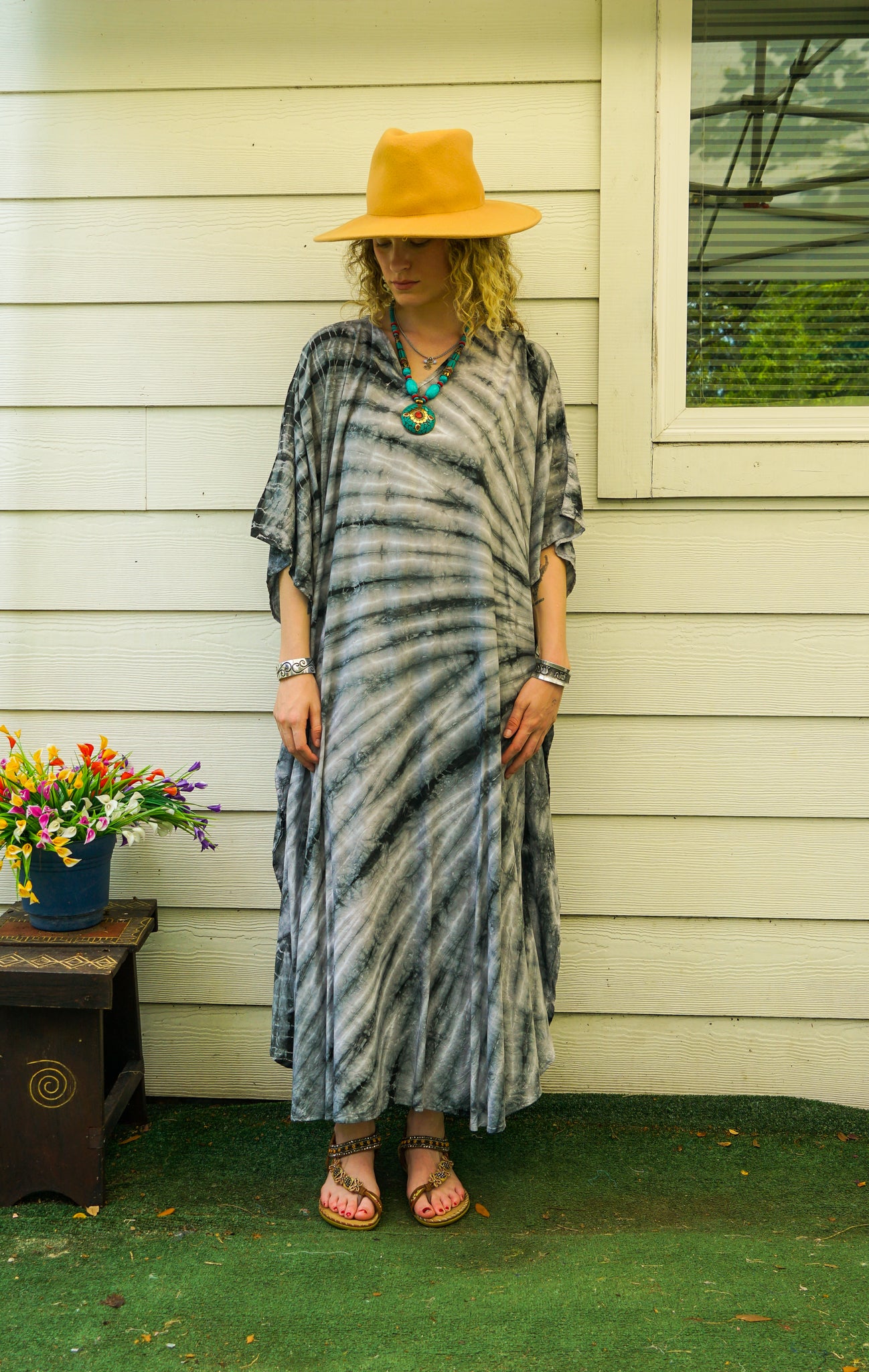 Made from lightweight, breathable rayon, this bohemian maxi kaftan drapes effortlessly over the body, offering a relaxed and flattering silhouette for all body types. Designed for comfort and versatility, it works beautifully as a beach cover-up, resort wear, lounge dress, or everyday boho essential. Whether styled with sandals and jewelry or worn barefoot at home, the Smoky Stone Waves Kaftan feels serene and effortless.