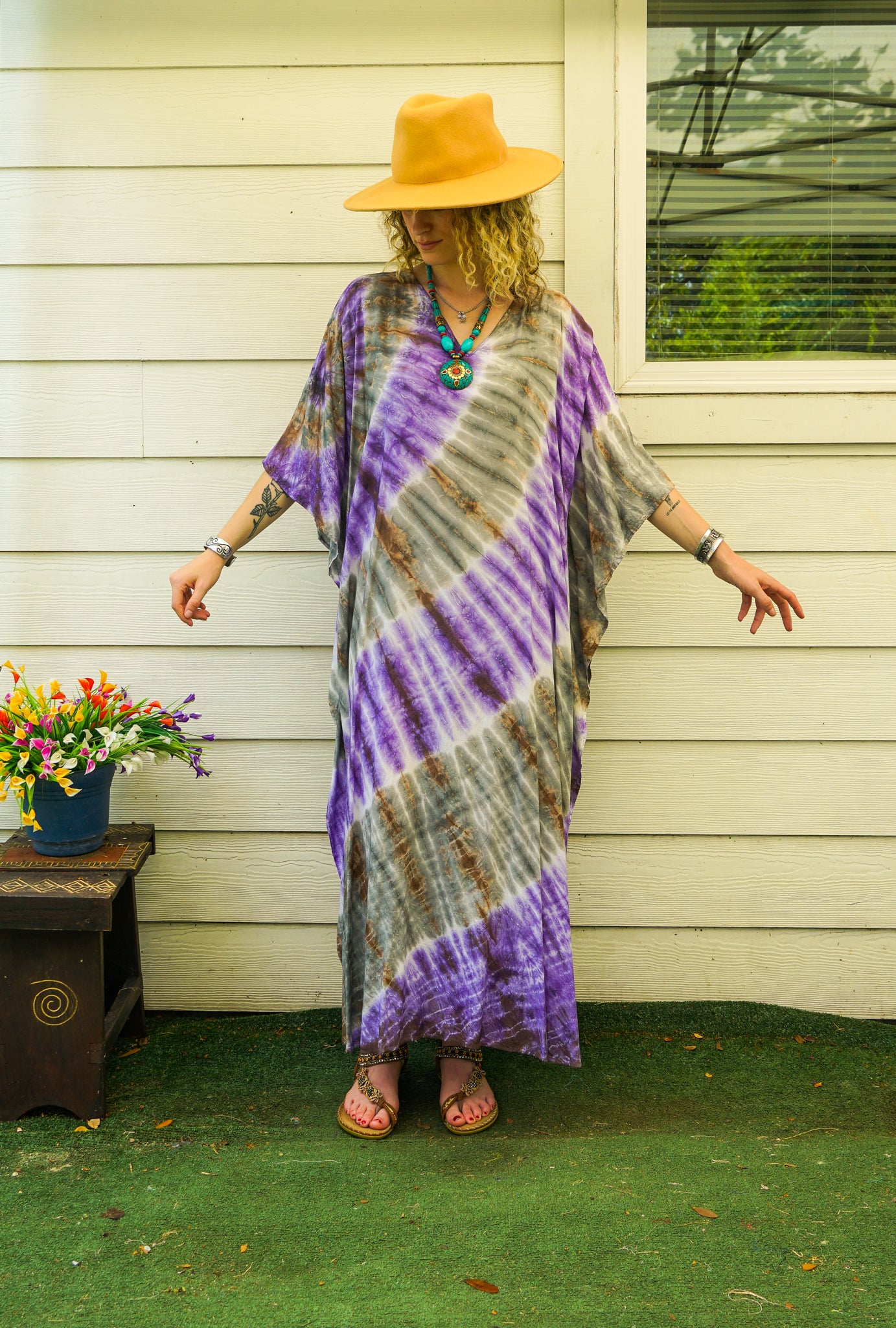 The Amethyst Earth Kaftan is inspired by the meeting of sky and stone — where soft violet hues flow through grounding earth tones. Hand-dyed in shades of amethyst purple, misty gray, and warm brown, this piece feels calming, expressive, and deeply connected to nature. The flowing, wave-like pattern moves organically across the fabric, making each kaftan completely unique.
