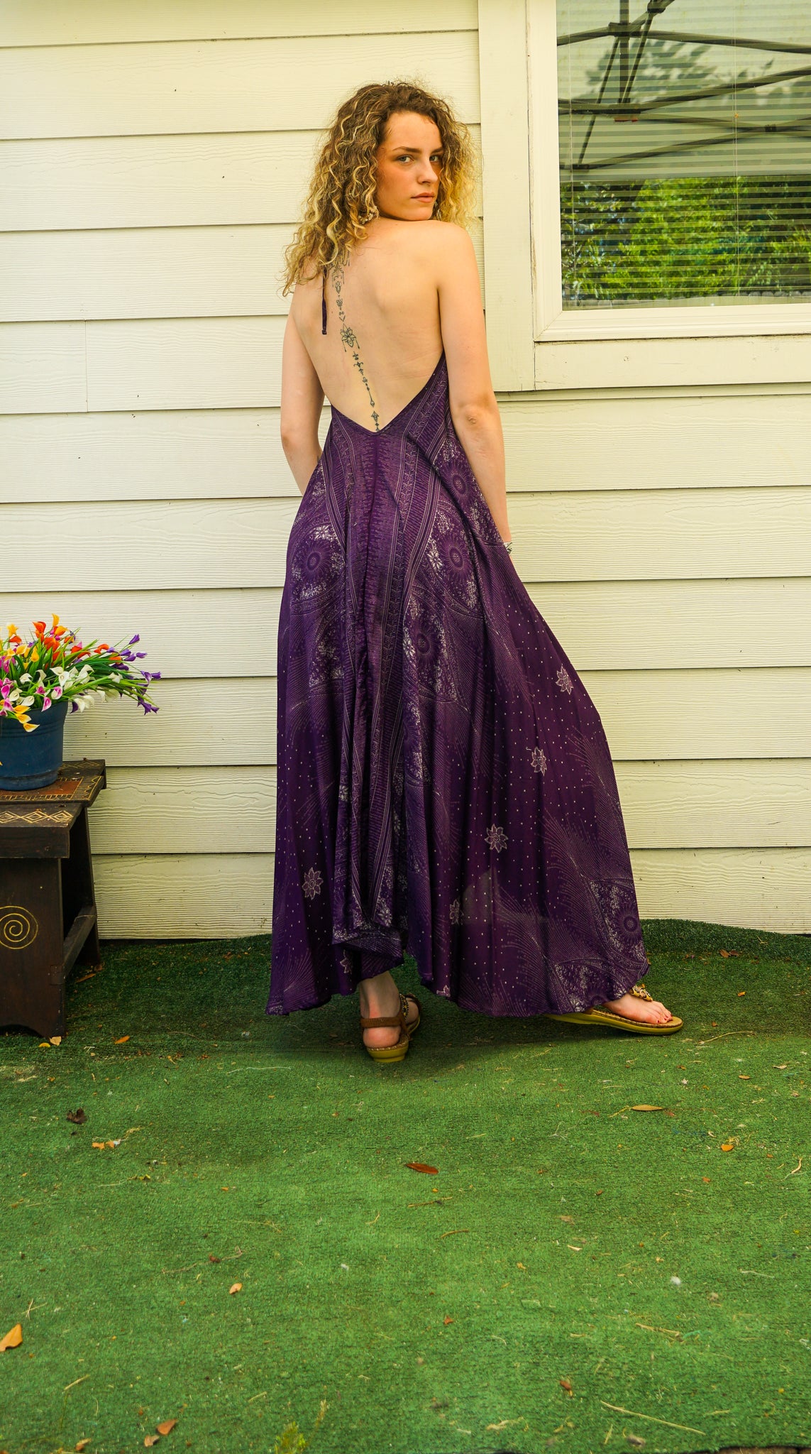 The plunging halter neckline highlights the shoulders and collarbone, while the open back creates an effortlessly sensual silhouette. Cut to drape freely over the body, this Goddess Maxi offers comfort, elegance, and beautiful movement in every step.
